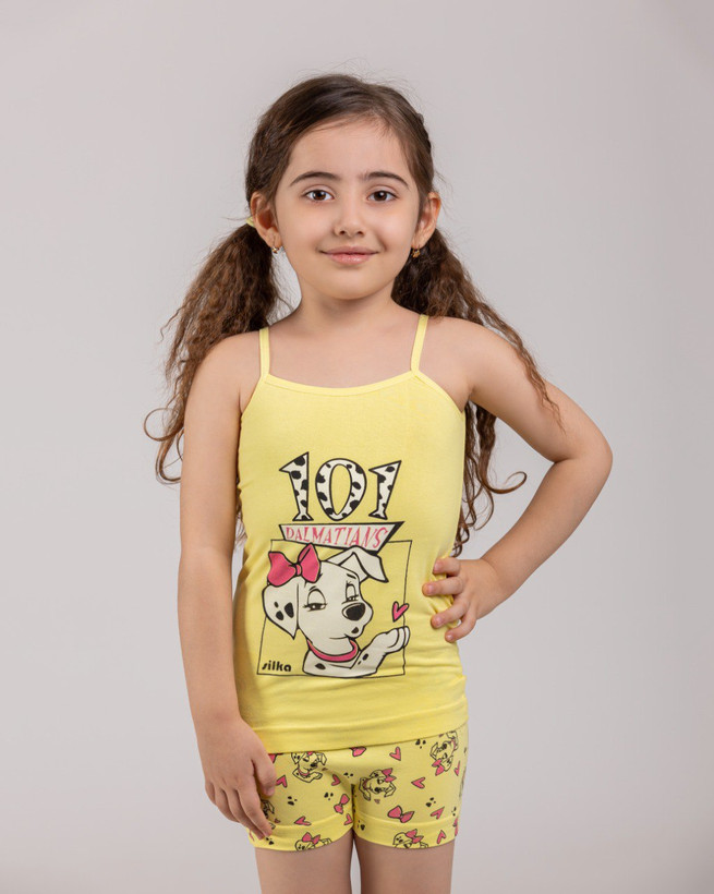 ست تاپ و شورتک دخترانه مدل راحتی خانگی و بیرونی طرح سگ خالدار رنگ زرد.جنس نخ پنبه