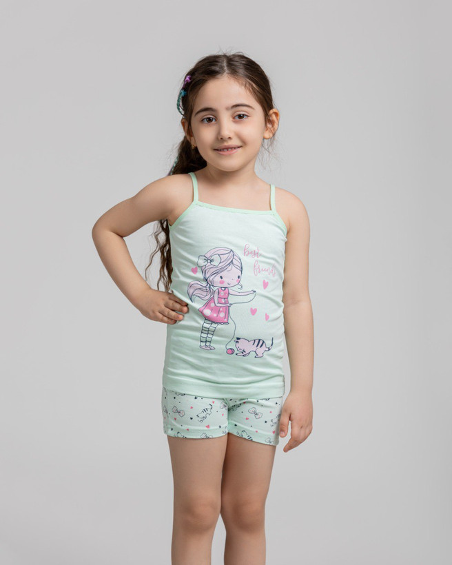 ست تاپ و شورتک دخترانه مدل راحتی خانگی و بیرونی طرح گربه cute رنگ سبز.جنس نخ پنبه